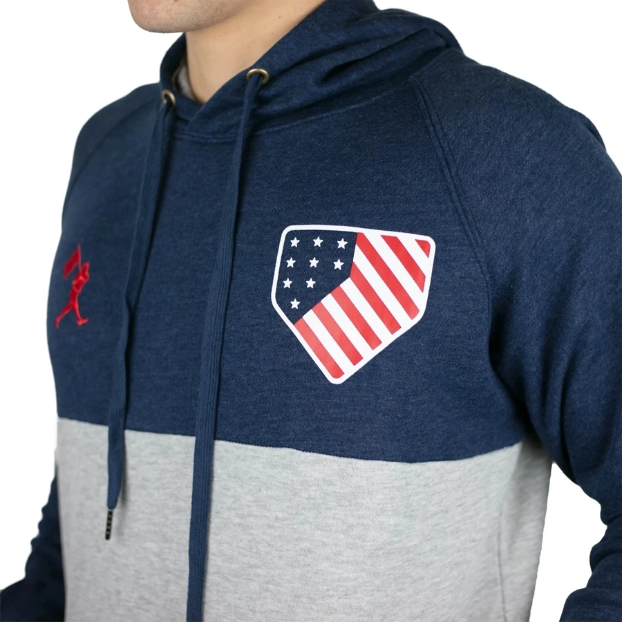 America and its pastime are represented with pride on this color blocked hoodie featuring the Flag Man and Baseballism’s iconic Home Team logo.
